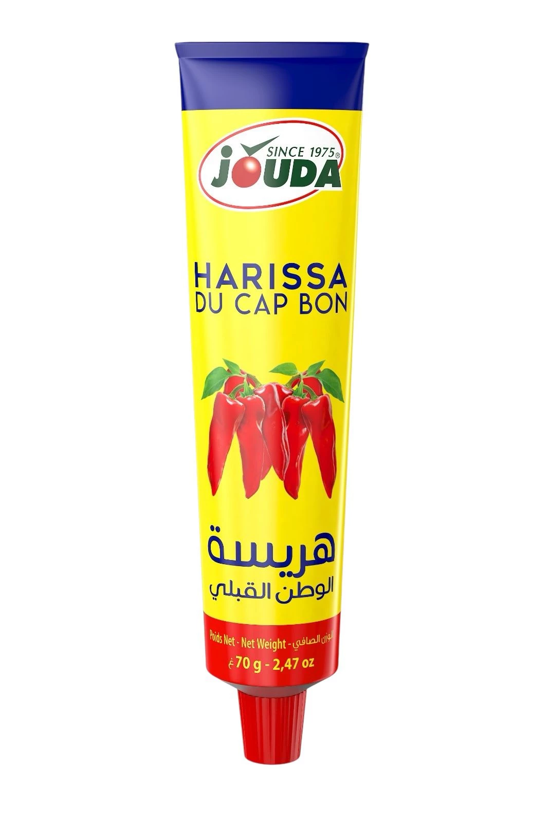 Jouda Harissa. Traditional North African chili paste made from red peppers, garlic, and spices, delivering a bold, hot, and smoky flavor. Certified Halal. Packed in 70 g tins, perfect for individual use or retail sale. Supplied as a case of 24 × 70 g. Store in a cool, dry place; refrigerate after opening.read more..
