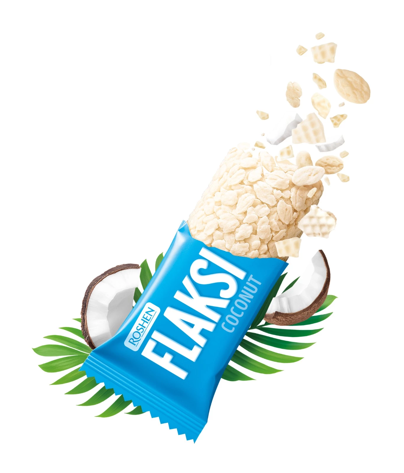 Roshen Flaksi Coconut is a crispy wafer flake candy with a sweet coconut coating, packed in a plastic bag (soft pack) with 500 g per bag and supplied as a wholesale case of 8 x 500 g—well-suited for retail confectionery shelves, international assortments, and impulse placements; store in a cool, dry place away from heat and direct sunlight.read more..