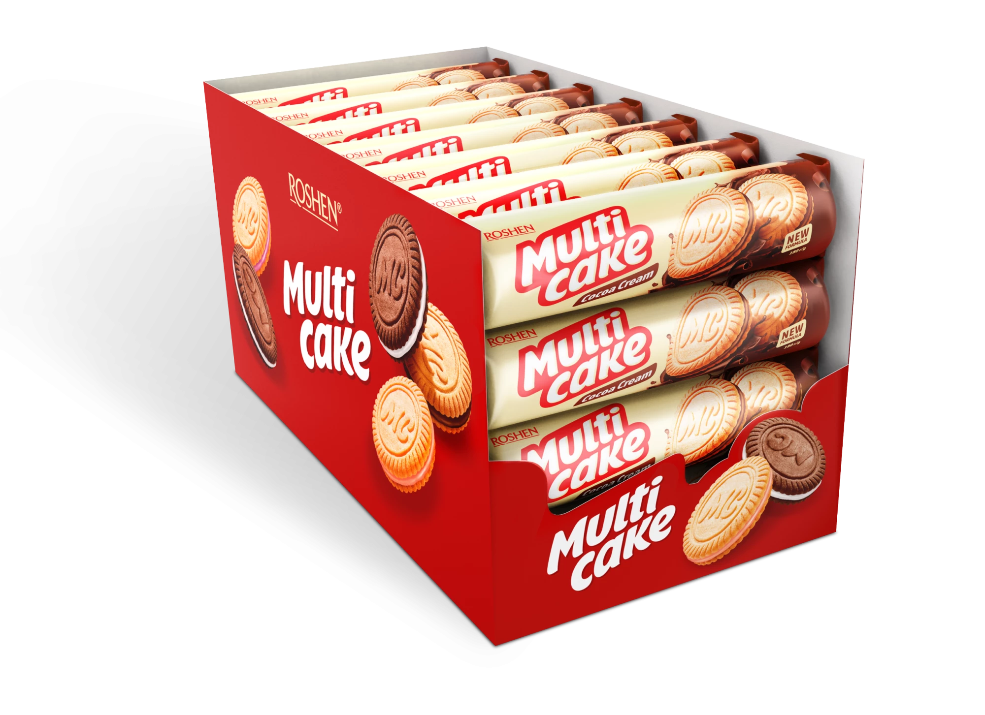 Roshen Multicake Strawberry – Soft cocoa sandwich cakes with a sweet strawberry cream filling, combining fruity flavour with smooth texture. Delivered in a carton of 28 packs, each 180 g. Store in a cool, dry place.read more..
